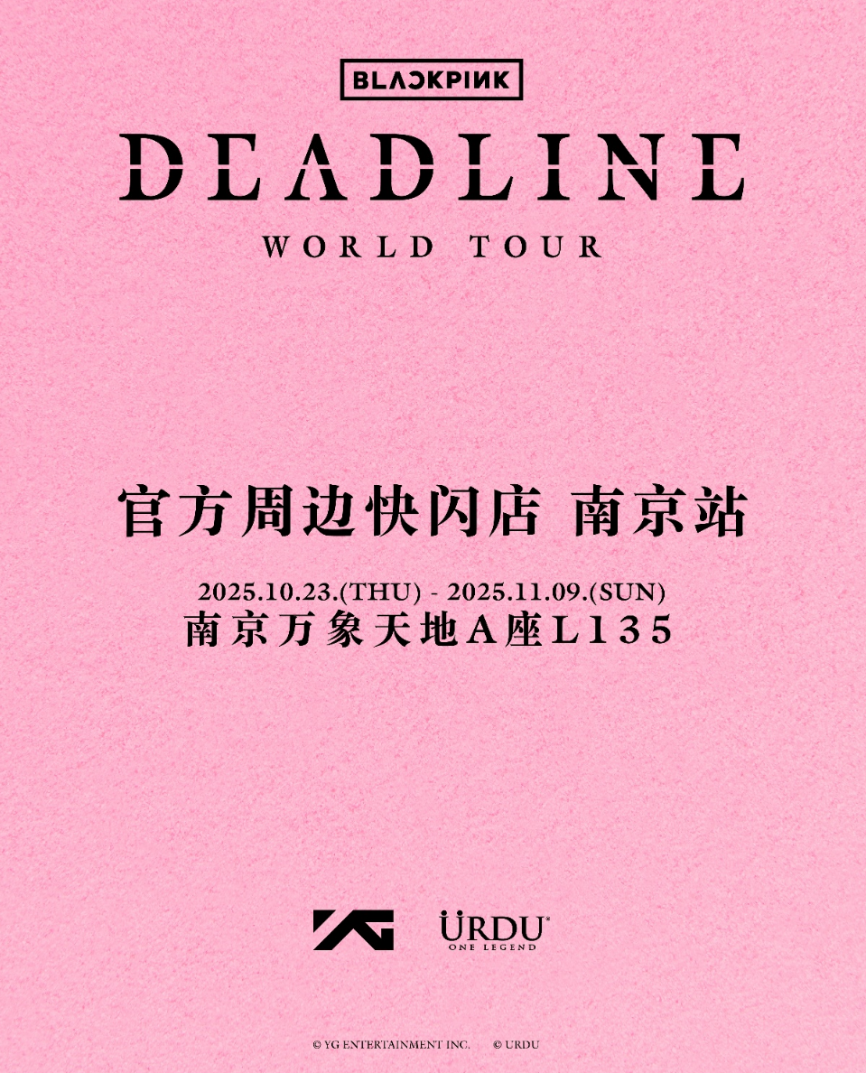 2025年10月23日,南京——YG娱乐与URDU携手在中国举办的“BLACKPINK WORLD TOUR <DEADLINE> POP-UP STORE”快闪活动,继首站在杭州成功展出并引发了众多粉丝的热烈反响后,现来到江苏省南京市,于南京万象天地盛大开幕。