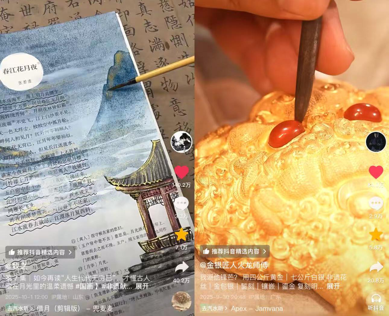 @牧之用国画在课本上再现千年前古人借春日夜景传递的温柔意象。一江春水,满枝桃花,在熟悉的纸张上洇开一凼月光,道尽缠绵又婉转的思绪,获赞140.2万。@金银匠人火龙师傅 用四公斤黄金和七公斤白银复刻古兵器“永乐剑”,通过非遗花丝、金包银、錾刻、镶嵌、鎏金等传统手工技艺再现名剑神韵,不仅还原了剑身的凌厉线条和纹饰的细腻质感,更让冰冷的金属化作历史的载体,传递匠人精神与潇洒意气,获赞84万。