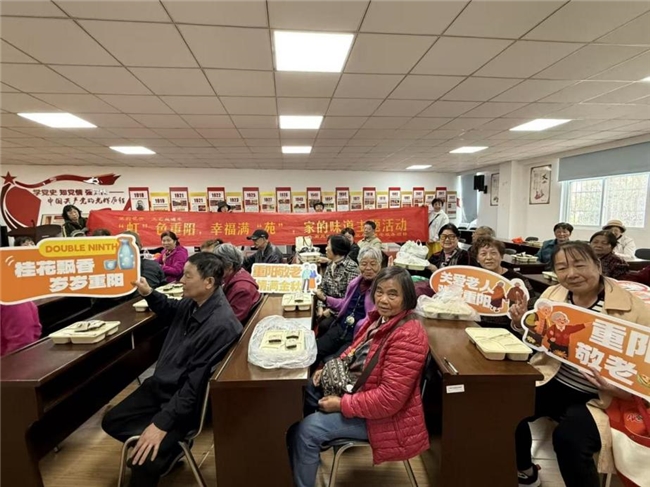 登高结束后,社区为大家准备了暖意融融的重阳节午宴。席间,社区书记代表全体工作人员,向在座的老人们送上了最诚挚的节日祝福。活动的高潮之一是发放重阳糕,一块块软糯香甜的重阳糕,不仅承载着“步步高升”的健康祝福,更饱含着社区对长者们的深切关怀。老人们品尝着美味的糕点和丰盛的菜肴,脸上洋溢着幸福的笑容,现场气氛温馨而热烈。