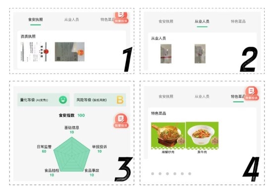后台监测除了可以实时查看商家后厨情况以外,还可查看商家证照信息、从业人员健康证、商家特色菜品等,并可清晰可见该商家的“食安指数”。如发现食品安全问题,可随时在线投诉,可谓是做到了真正的商家全透明。