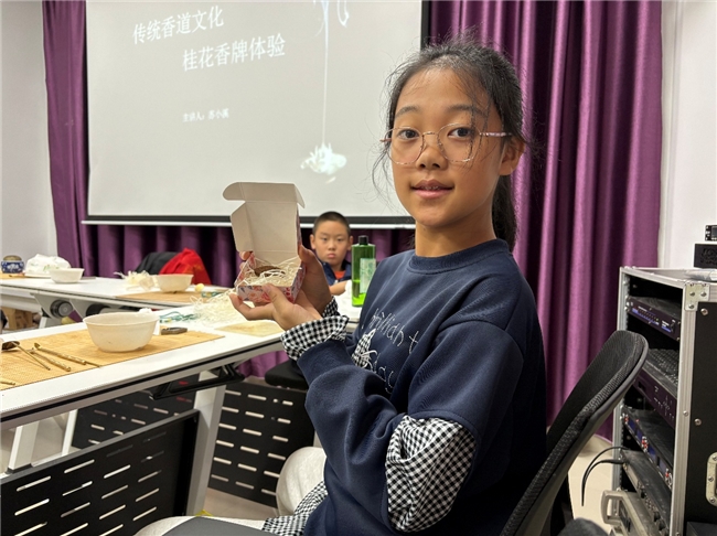 接下来是香牌制作环节,居民们紧跟老师的示范,逐步操作。先取适量檀香粉倒入容器,加入水后反复揉捏,直至香泥变得细腻温润。接着将香泥小心翼翼填入刻有吉祥纹样的模具,用工具轻轻按压紧实,确保纹路清晰完整。静置片刻后缓慢脱模,再用工具仔细切割边缘,让香牌造型更显精致。最后,每个人都收获了寓意美好的香牌,装入礼盒中,送老人、送朋友,共度重阳。