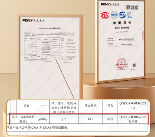 工艺的硬实力,最终落地为数据级的成分优势:每100g孢子油总三萜实测49.2g,远超国家标准2倍(国标仅要求≥20g),而行业平均水平仅为25-30g;麦角甾醇含量83mg/100g,是普通孢子油的2-3倍——这些成分不是空谈的营养,而是调节免疫、抗氧化、养护肝脏的核心动力,让科学滋补成为可量化的品质优势。