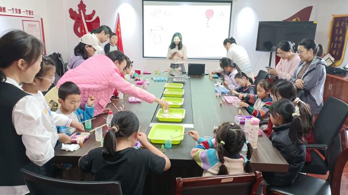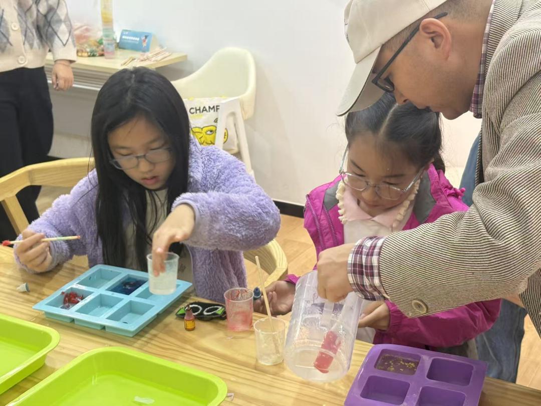 演示结束后,孩子们迫不及待地动手操作。在西湖社区,孩子们认真按照步骤加热皂基、调配色彩,小心翼翼地将桂花点缀其中,专注的神情尽显对作品的期待;新娄社区的孩子们更是创意十足,有的捧着滴管仔细控制色素用量,看着透明皂液渐变成粉、黄、蓝等缤纷色彩,脸上满是惊喜;有的在柠檬味、薰衣草味精油间反复挑选,最终选定心仪香气融入皂液;还有的互相分享撒桂花的小技巧,遇到操作难题时及时向老师请教,互帮互助的场景格外温馨。