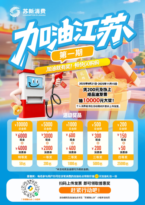 据了解,消费者在江苏境内加油满200元并开具个人发票,即可参与抽奖,最高可获1万元奖金,同时所有参与者均可在加油站点领取价值1000元的加油礼包。为扩大活动覆盖面,江苏银行不仅在省内各网点、近4000家合作加油站布设宣传物料,还借助节假日车展精准触达成品油消费人群,有效激发民众出行热情,让政策红利真正惠及终端消费者。