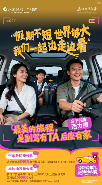 在出行消费领域,江苏银行积极承接由江苏省商务厅、财政厅、税务局联合主办的“加油江苏”有奖发票活动,并在江苏银行微信小程序“苏银随心办”上线,为消费者打造便捷参与通道。