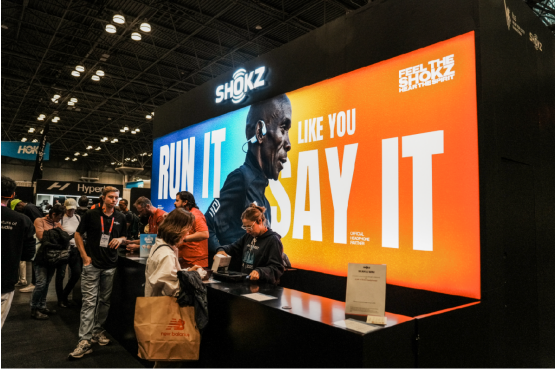 在本次纽约马拉松期间,Shokz韶音远不止于简单的品牌露出,而是通过一系列精心策划的活动,将“赛事”、“产品”与“社群”三者深度融合,呈现出一个立体而完整的品牌体验系统。在产品层面,韶音通过体博会,让赛事成为产品体验的真实场域。例如,韶音旗舰运动耳机OpenRun Pro 2就成为人们关注的焦点,吸引众多跑者现场体验。