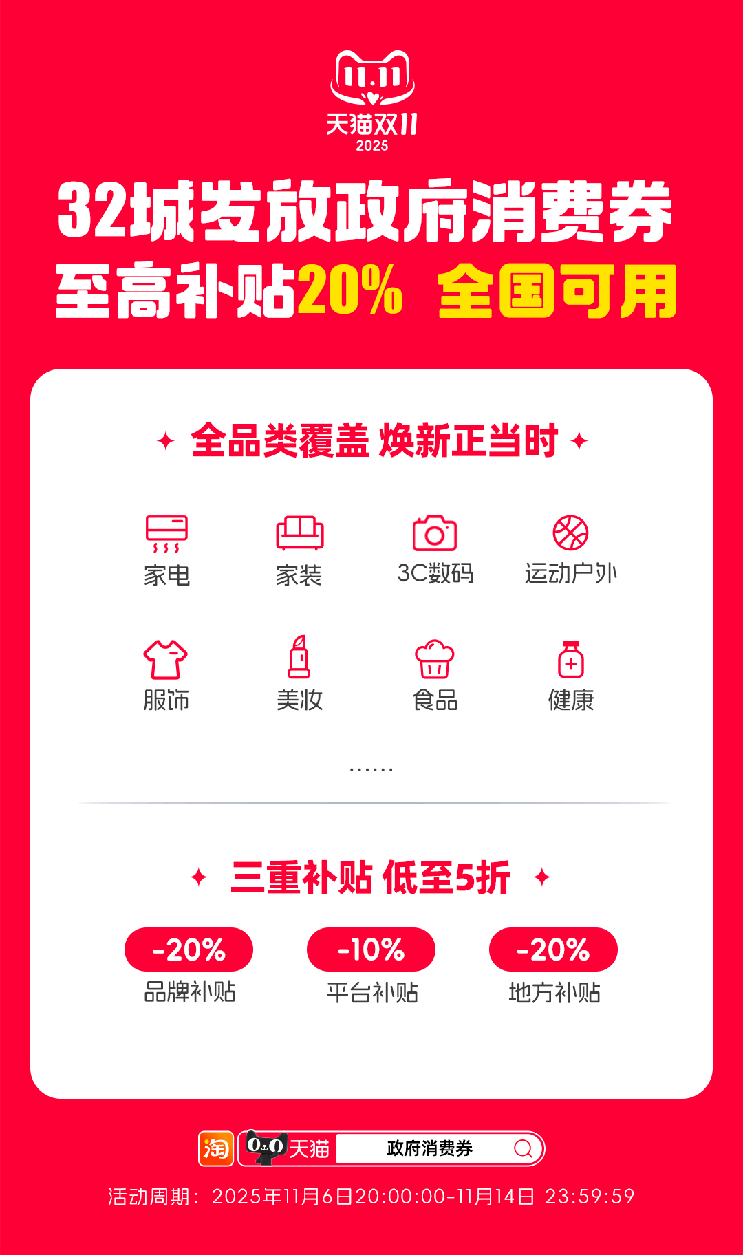 11月7日起,全国32个城市在淘宝发放政府消费券,加码天猫双11,全国消费者可领可用,单品至高补贴20%,覆盖家电家装、3C数码、运动户外、服饰、美妆、食品等品类,与天猫双11优惠叠加后低至5折。通过淘宝APP搜索“政府消费券”即可直达。