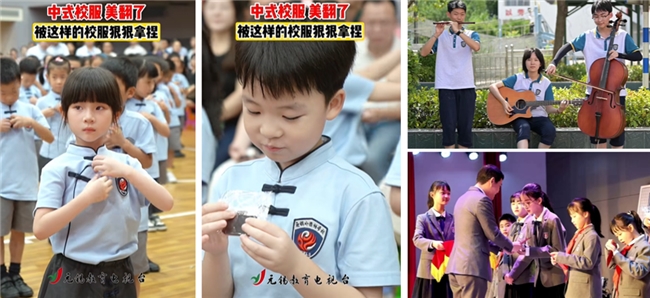河南省实验中学、沈阳志成中学、无锡外国语学校、成都墨池书院小学等更将校服款式设计配搭与学校情境教育深度融合——河南省实验中学以航空班为灵感,用天空蓝与海洋青的配色传递“载志而航”的精神,领口的“飞机跑道”暗纹,将“向天空出发”的期许融入日常。成都墨池书院小学则以立领、盘扣、水墨纹样呼应“墨池文脉”,与灰瓦白墙的书院建筑形成文化共振。沈阳志成中学、无锡外国语学校的校服款式多样,适宜课堂、运动、展演、对外交流、社团活动等多场景穿着,其采购过程,充分注重家长、学生的参与和选择,让校服真正成为校园文化传承的“流动名片”。学生穿着照片、校园活动影像在社交媒体平台引发网友赞叹,“原来校服也可以这么好看!”成为高频评论。