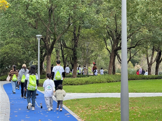 立冬过后的青剑湖,依然翠绿的草坪,优美的湖景和植被丰富的绿化,让整个徒步路线成为孩子们的“自然探索乐园”。工作人员为每个家庭准备了能量补给包以及环保工具,统一的运动t恤让徒步队伍成为了一道亮丽的风景线。