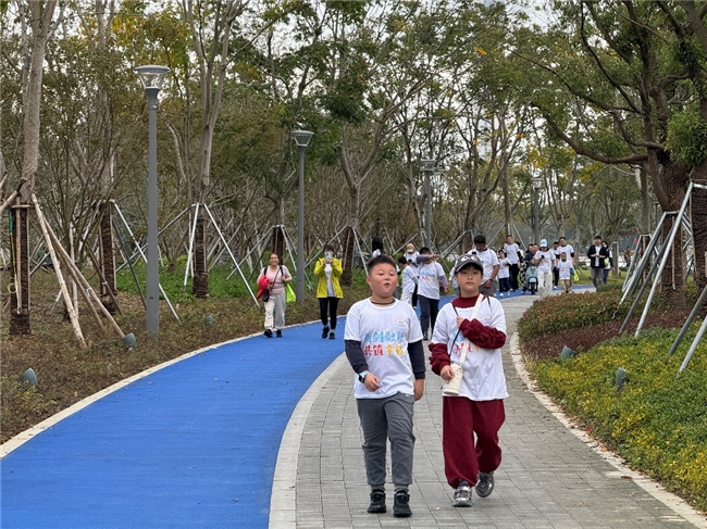 随后,活力徒步环节正式开启。沿着青剑湖公园风光旖旎的健身步道,亲子家庭们并肩前行,有的小朋友牵着家长的手,兴奋地分享沿途发现的小野花、湖边的水鸟;有的则化身“小领队”,提醒大家不要偏离方向。4km 的路程虽有挑战,但在欢声笑语中,所有家庭都顺利抵达终点。