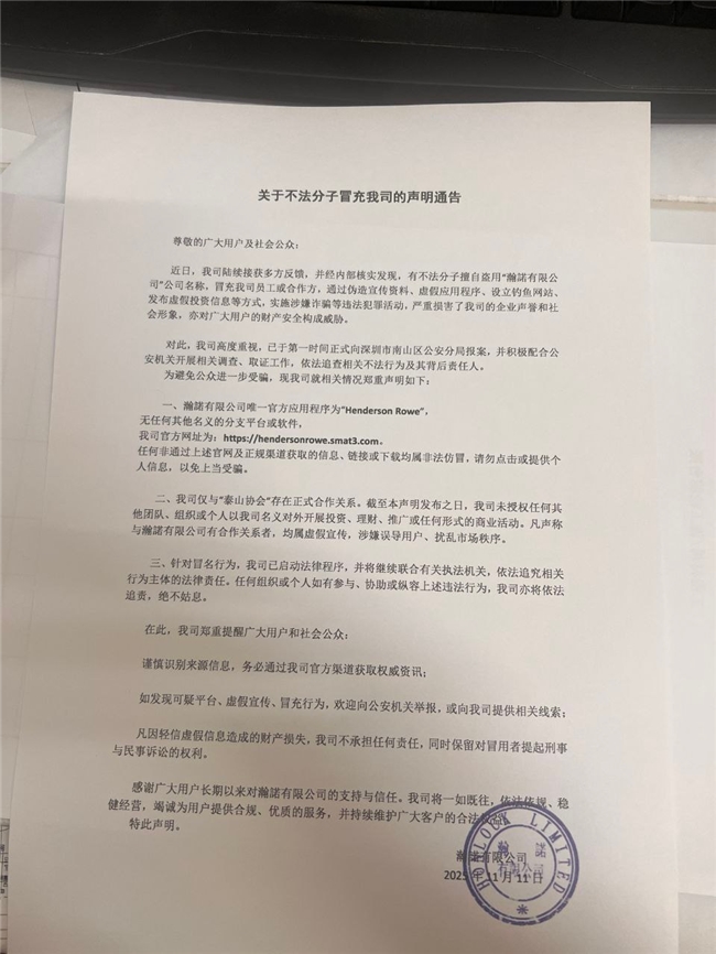 瀚诺有限公司特别强调,截至本声明发布之日,公司仅与“泰山协会”存在正式合作关系。除上述机构外,公司未授权任何其他团队、组织或个人以公司名义开展投资、理财、推广或任何形式的商业活动。凡对外宣称与瀚诺有限公司有合作关系者,均属虚假宣传,涉嫌误导用户、扰乱市场秩序,公司将保留追究法律责任的权利。