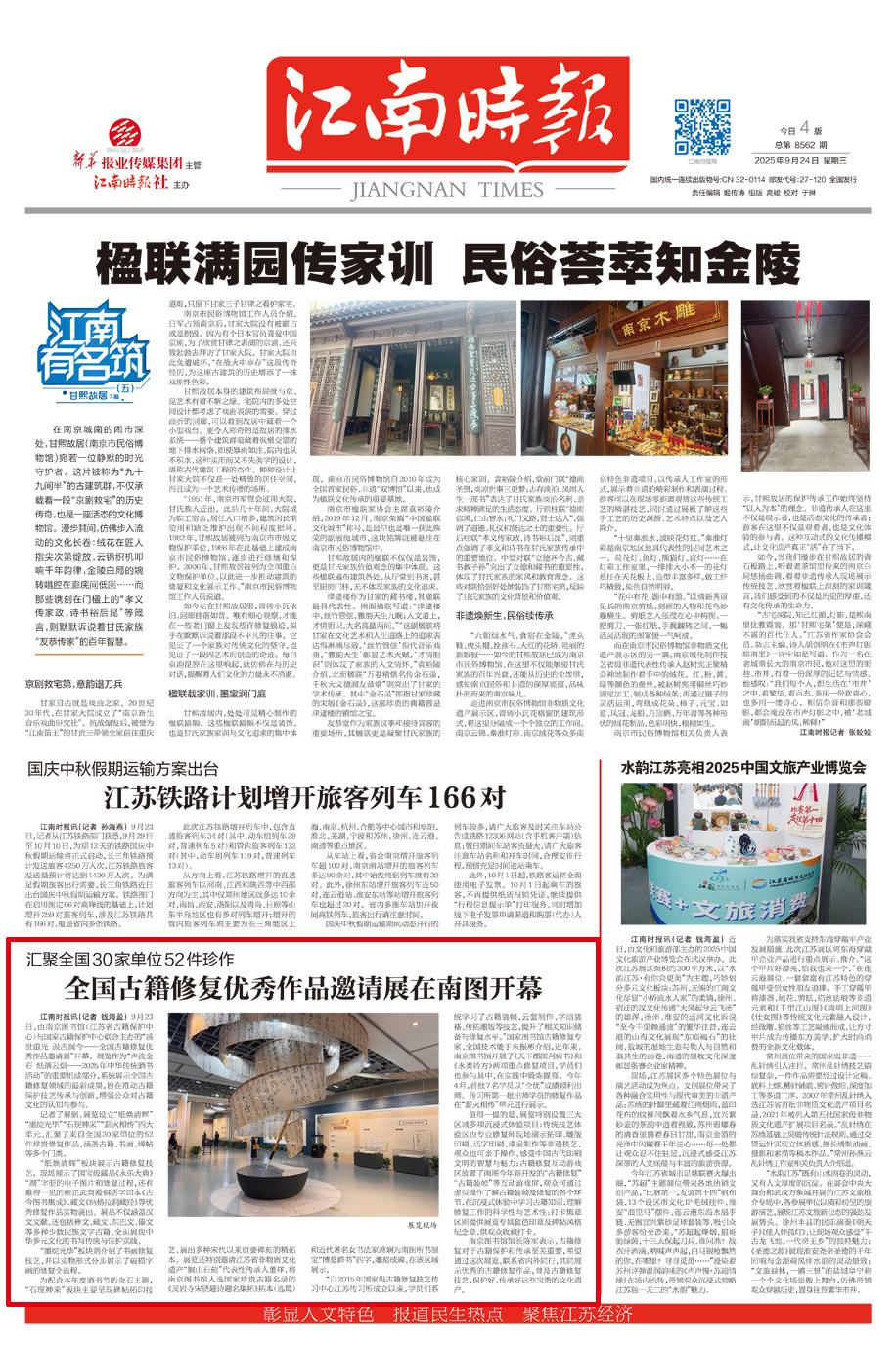 江南时报讯(记者 钱海盈) 9月23日,由南京图书馆(江苏省古籍保护中心)与国家古籍保护中心联合主办的“盛世重光 汲古润今——全国古籍修复优秀作品邀请展”开幕。展览作为“声流金石 纸落云烟——2025年中华传统晒书活动”的重要组成部分,系统展示全国古籍修复领域的最新成果,旨在推动古籍保护技艺传承与创新,增强公众对古籍文化的认知与参与。