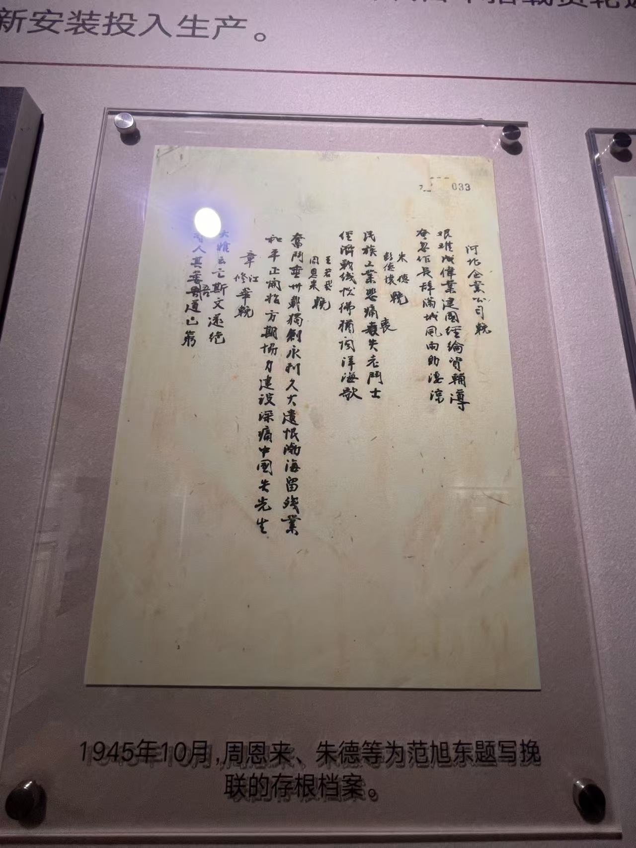 展览还特别呈现了一批具有特殊历史意义的珍贵文献,其中周恩来、王若飞以及彭德怀、朱德为爱国实业家范旭东题写的挽联存根档案系首次展出。1945年10月6日,《新华日报》报道了范旭东逝世的消息,周恩来代表毛泽东亲往吊唁并写下挽联。