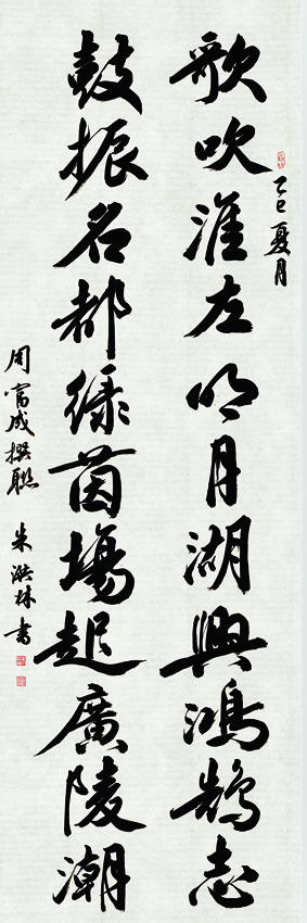 周富成说,“苏超”赛事的热烈氛围是灵感的直接源泉。这副楹联以白描手法与朴素情感,定格了古城扬州的赛事盛况,更彰显了市民对体育文化的热爱。上联聚焦赛事地理方位,下联铺展联赛氛围,上下联分工明确、情景交融。“歌吹”取自杜牧“谁知竹西路,歌吹是扬州”,暗合扬州人欢庆赛事的场景;“淮左”“名都”引自姜夔《扬州慢》,精准标注古城身份;赛事举办地附近的“明月湖”与象征远大抱负的“鸿鹄志”自然衔接,实现从景到理的升华;“鼓振”呼应赛事声势,“绿茵场”上的运动激情则与扬州历史上“波澜壮阔”的“广陵潮”相呼应,将体育活力与城市底蕴完美融合。