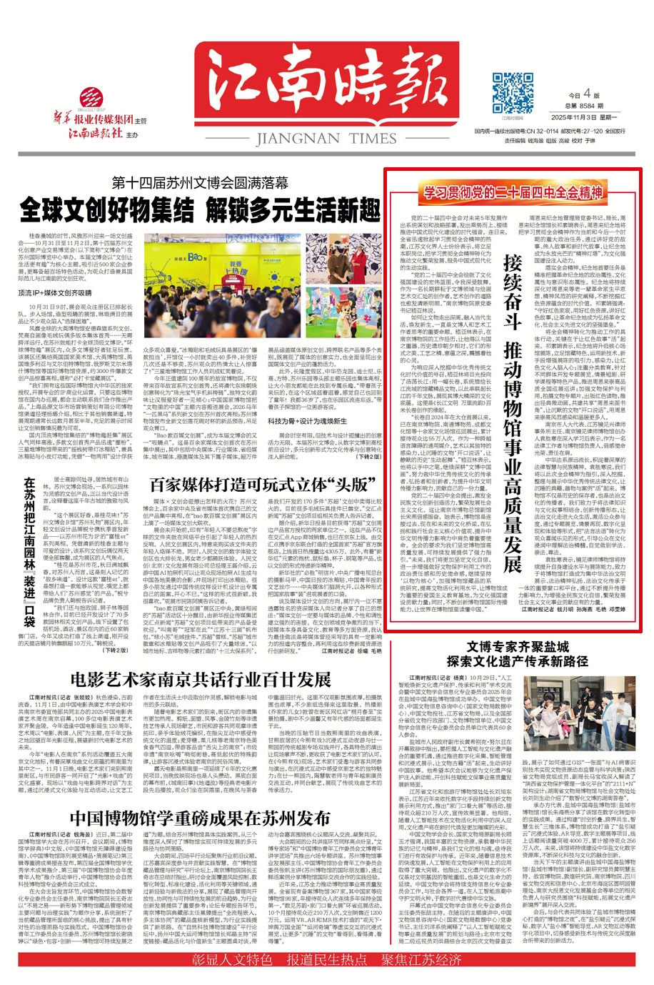 党的二十届四中全会提出,激发全民族文化创新创造活力,繁荣发展社会主义文化。这让南京市博物总馆副馆长宋燕倍感振奋。她表示,博物馆是连接过去、现在和未来的文化桥梁,在弘扬和践行社会主义核心价值观、提升中华文明传播力影响力中肩负着重要使命。全会的要求为我们坚定博物馆高质量发展、可持续发展提供了强力指引。“未来,我们将更加坚定文化自信,进一步增强做好文物保护利用工作的政治责任感和历史使命感,继续坚持‘以物为核心’,加强博物馆藏品的系统研究,提高文物活化利用水平,让博物馆成为重要的爱国主义教育基地,为文化强国建设贡献力量;同时,不断创新博物馆国际传播能力,让世界在博物馆里读懂中国。”