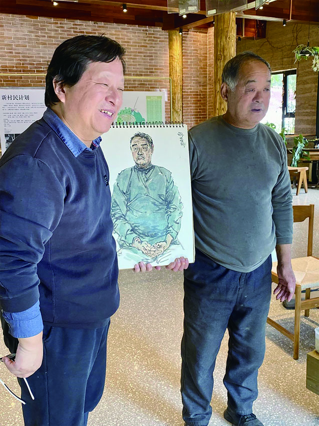 南京市文联副主席、南京市美术家协会主席徐惠泉(左),以画笔为村民写生