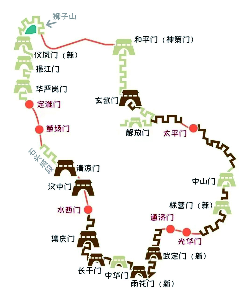 南京城墙示意图(橙线处为城墙未连通段)